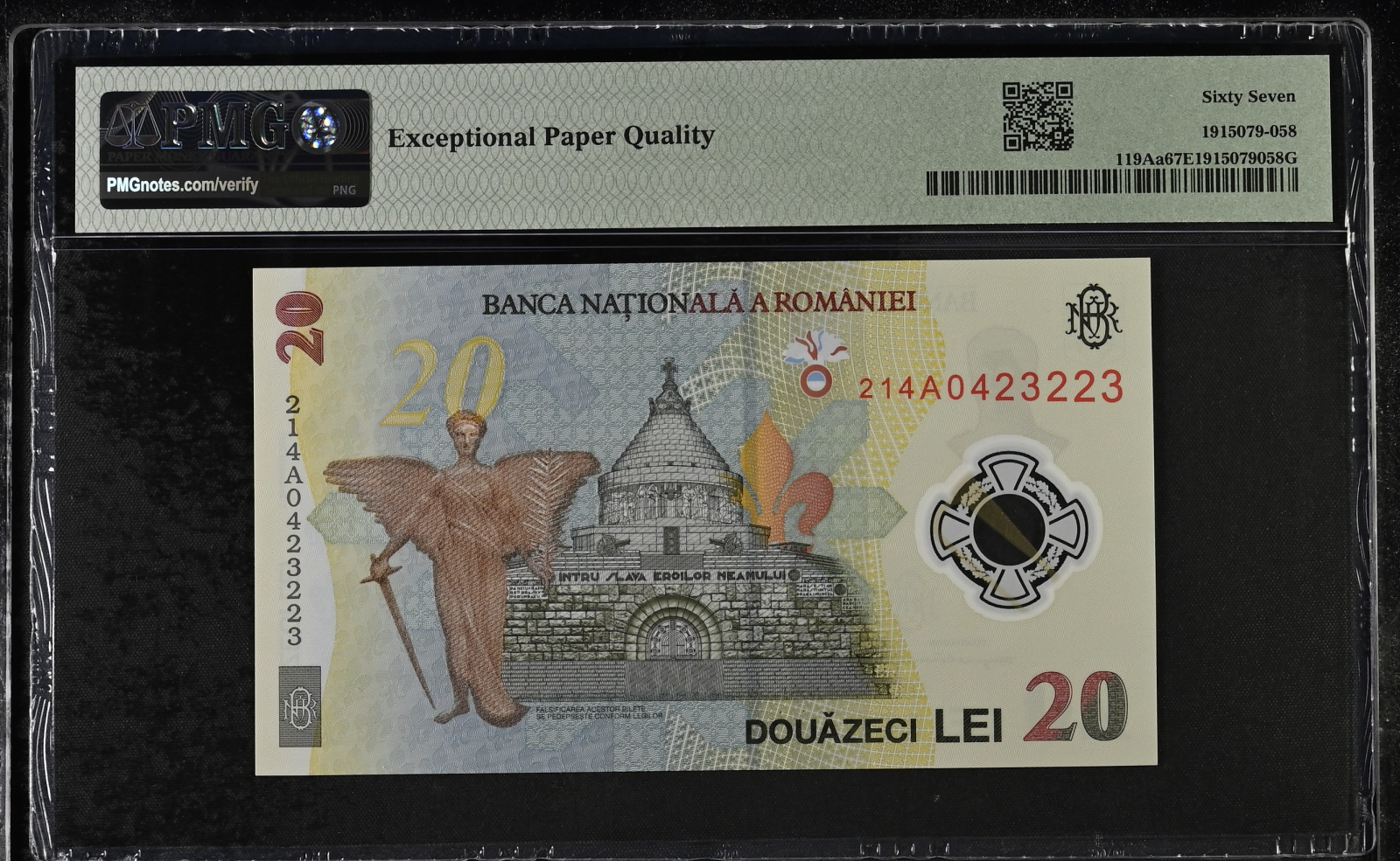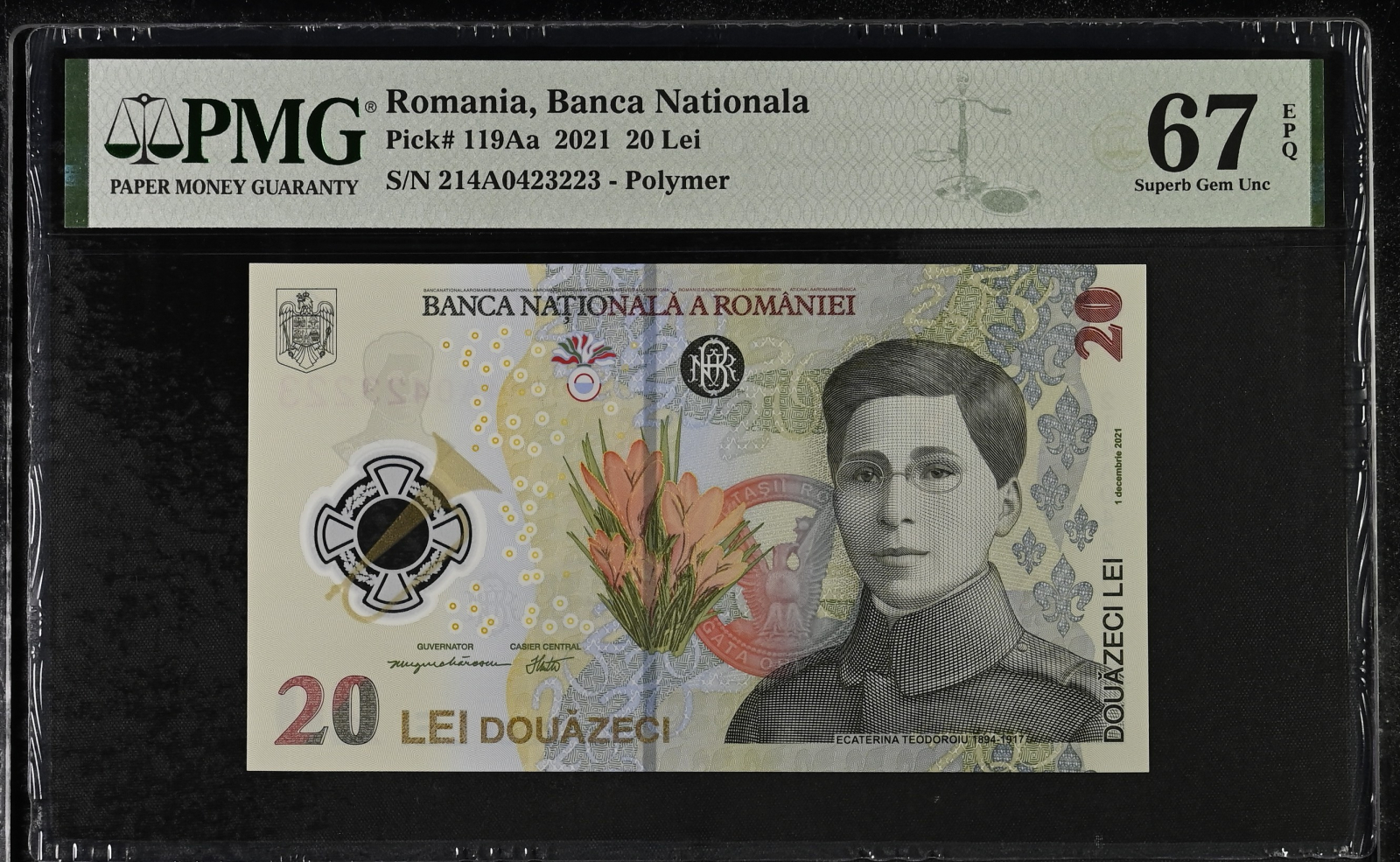 Romania, BNR, 20 lei 2021 P119Aa PMG Gem Uncirculated 66 EPQ
